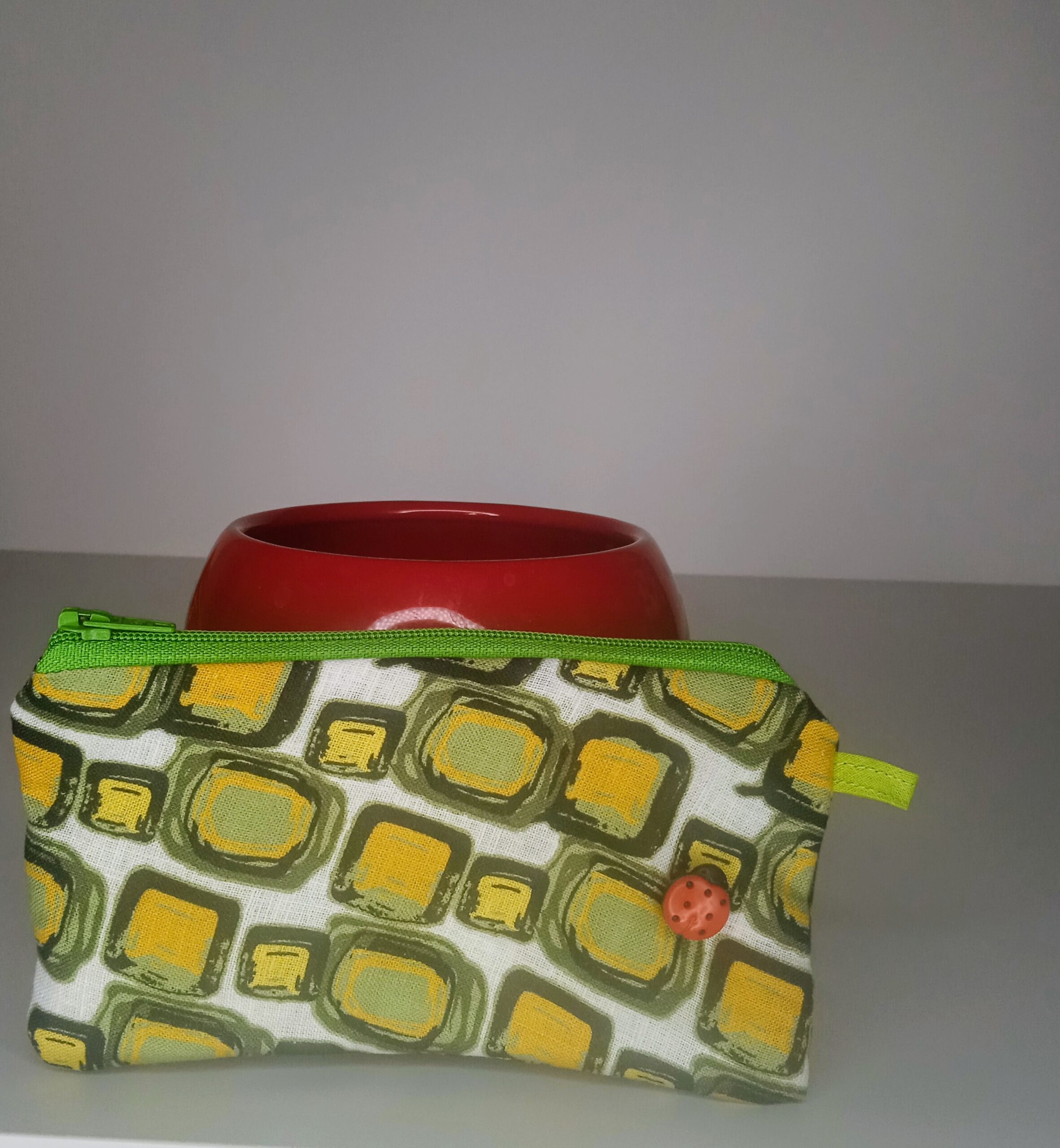 Astuccio basico in cotone, base bianca con geometrie sul verde. Fodera interna e Zip verde. Immancabile accessorio da borsa. Piccola coccinella su un lato di “buon auspicio”. Misure: Altezza 9cm circa, Larghezza16cm circa.
